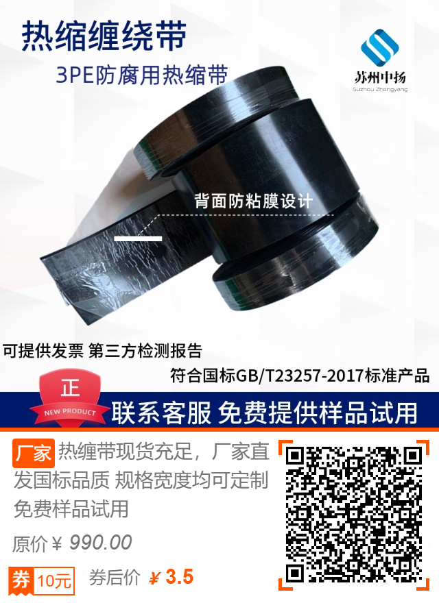 所以施工時,請一邊解卷纏繞,一邊去除防粘膜,不要提前撕開,以免影響防腐效果,市面上也有不帶防粘膜的熱縮纏繞帶,跟膠布一樣,各方面性能肯定是不如帶防粘膜的好。