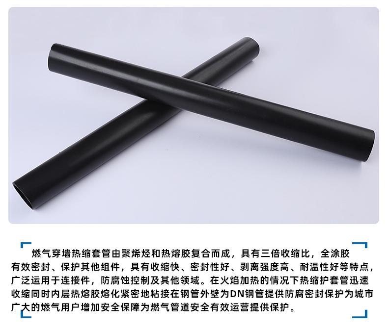 咱們中揚一直以燃氣管道穿墻保護熱縮套管為主打產品,這種熱縮套管廣泛應用于城市燃氣管道中兩根鋼管的焊接處和燃氣支管的連接處。我公司生產的熱縮穿墻熱縮套管規格齊全,可定制生產。